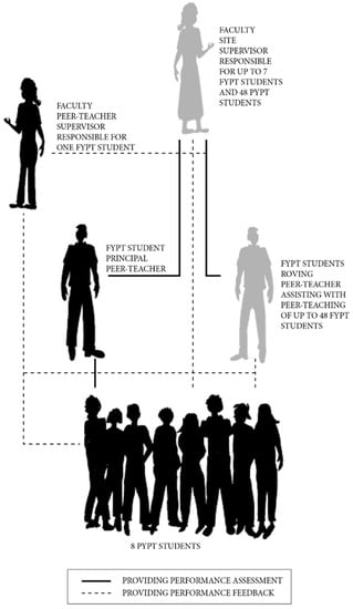The placement was implemented over two sites simultaneously, and assessment of the FYPT student performance was undertaken by two additional faculty supervisors who each remained full time at one site for the duration of the placement. These supervisors were each responsible for up to 7 FYPT students, observing their performance as peer teachers, and providing daily feedback as to performance, with titration and remediation where required.