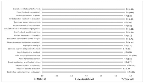 These observations triangulate with several of the highest scoring items of the measure of quality of giving feedback scale such as establishing a climate of trust and support (mean 6.7; SD 0.55); using non-judgmental language (mean 6.8; SD 0.47); and allowed students time to self-assess (mean 6.7; SD 0.54).