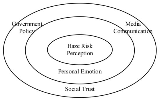 The center in the figure is haze risk perception, the middle layer is personal emotions, and the outer layer is media communication, social trust and government policy. We believe that haze risk perception is directly affected by personal emotion, and then indirectly affected by external media communication, social trust and government policy.