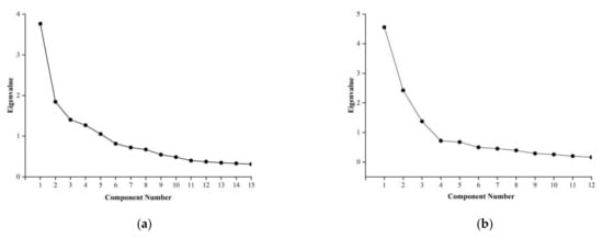 We conducted factor analysis on 15 items of HRPS and judged the number of factors based on the explanatory variance rate and the scree plot. The results showed that five common factors could be extracted. The eigenvalues were 3.765, 1.847, 1.403, 1.268 and 1.053, respectively. The explanatory variance rates after rotation were 16.778%, 14.403%, 13.231%, 11.119% and 10.796%, respectively, accounting for 66.327% (>60%) of the total variation. Combined with the eigenvalue and scree plot (Figure 3a), the HRPS could be divided into five factors.