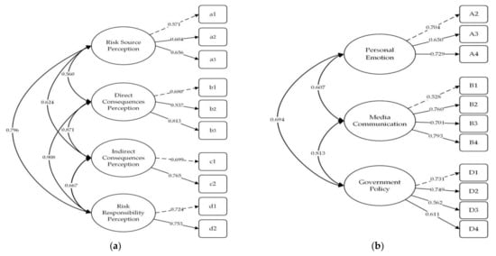 There are 22 items in the questionnaire (10 items in HRPS and 12 items in HRPIFS), and as the 404 valid questionnaires are far more than ten times the number of items, the survey is suitable for CFA []. The HRPS still uses a, b, c and d to represent the risk source perception, direct consequences perception, indirect consequences perception and risk responsibility perception, respectively. The HRPIFS still uses A, C and D to represent personal emotion, media communication and government policy, respectively.