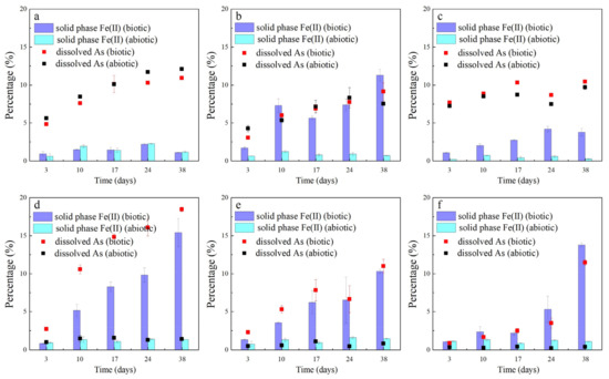 Variation in dissolved As in the supernatant and solid-phase Fe(II) as percent extracted of total in soil under biotic and abiotic conditions with different LMWOAS amendments in unremediated soils. (a) Oxalate, (b) citrate, (c) phytate, (d) malate, (e) lactate, (f) acetate.