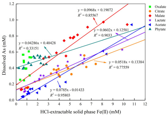 Low-molecular-weight dissolved organic carbon can enhance the biotic or abiotic reductive dissolution of iron oxides, oxyhydroxides, and hydroxides in the presence or absence of Fe(III)-reducing microbial communities [47]. In addition, HCl-extractable Fe(II) is biologically available to microorganisms, and it could represent predominant biological and chemical sources of Fe(II) species produced by ferric iron reduction and could keep their concentration and valence state stable during the extraction [48]. The HCl-extractable total Fe(II) includes dissolved and solid-phase Fe(II). Since the Fe(II) content of the supernatant constituted a very small proportion of the HCl-extractable total Fe(II), no significant correlation was found between As and Fe(II) in the aqueous solution (Figure S1). Therefore, only the solid-phase Fe(II) concentration was further analyzed. Data for solid-phase Fe(II) for the six samples are shown in Figure 2. In general (except for the oxalate treatment), the solid-phase Fe(II) concentrations of the remaining five biotic control groups were much higher than those of the abiotic control groups. In contrast, there was no clear relationship between the solid-phase Fe(II) or soluble As in different LMWOAS treatments. However, when the data from the six soil samples are plotted together, except for the oxalate treatment, which showed no relationship, a significant relationship between the solid-phase Fe(II) and soluble As for the other individual soil samples was observed (p < 0.05). The R2 value for the five soil samples ranged from 0.332 to 0.958 (Figure 3).