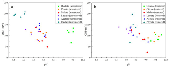 Soil pH and ORP distribution under biotic conditions with different LMWOAS amendments in unrestored (a) and restored (b) soils.