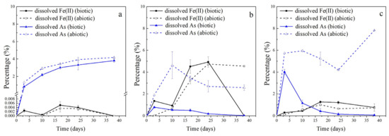Variation in dissolved As and Fe(II) in the supernatant as percent extracted of total in soil under biotic and abiotic conditions with different LMWOAS amendments in remediated soils. (a) Oxalate, (b) citrate, (c) phytate.
