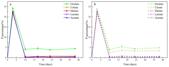 Dissolved P release as a percent of total P in soil under (a) biotic and (b) abiotic conditions with different LMWOAS amendments in unremediated soils.