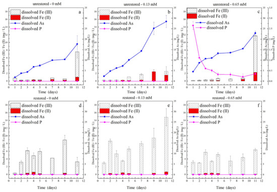 Variation in dissolved As, Fe(II), and Fe(III) concentrations in the supernatant under biotic conditions with different phosphate concentrations in unrestored and restored soils. (a) Unrestored, 0 mM, (b) unrestored, 0.13 mM, (c) unrestored, 0.65 mM, (d) restored, 0 mM, (e) restored, 0.13 mM, (f) restored, 0.65 mM.