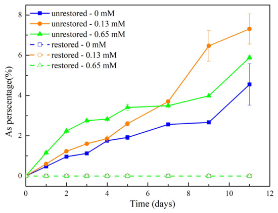 The changes in soluble P and As concentration in the unrestored soil are shown in Figure 7. The results clearly show that high P concentrations increase the initial As release, which was evident in the results for the 1st day. The higher the P concentration applied, the greater the As release, which is probably because phosphate promotes the release of As from the soil via competitive adsorption. However, it should be noted that the release of As still increased when the P concentration leveled off. This may be because the presence of phosphate promotes microbial action, resulting in persistent As release. Arsenate and phosphate create competition for the same transport channel protein. Phosphate stimulated As release due to fast bacterial reproduction because increasing phosphate concentration in the environment appears to decrease the growth inhibition attributed to the presence of arsenate [32].