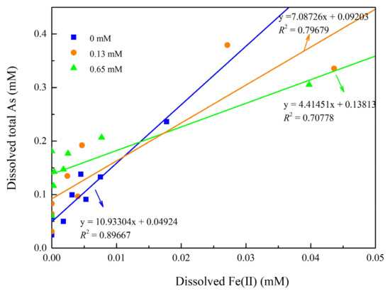 Although we found a higher initial release of As in the 0.65 mM phosphate groups, the 0.13 mM phosphate groups eventually released the most As at the end of the reaction (Figure 8). The proportion of soluble Fe(II) in the released dissolved Fe was the highest in the 0.13 mM phosphate groups. One possible explanation for the lower Fe(II) levels in the 0.65 mM phosphate groups is that dissolved Fe(II) reacts with the excess P to precipitate as Fe3(PO4)2 (vivianite). A similar phenomenon was observed by Zhang et al., (2017); additionally, the lack of P may lead to lower microbial activity in the 0 mM phosphate groups [14]. A significant positive correlation (p < 0.01) was observed between soluble Fe(II) and As in the solutions of the three groups (Figure 9).