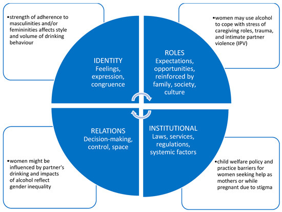 The impact of gender on alcohol use includes the influences of roles, relations, identities, and institutional practices, which work together to make up gender. These elements are temporal and culturally specific and interact with sex-related factors to produce effects or impacts, and potentially have differential impacts in different countries or societies. Figure 1 presents the main categories of the gender concept, with an example of the impact of alcohol in each quadrant.