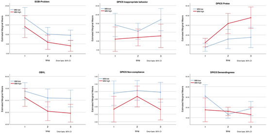 A significant interaction effect of mind-mindedness was found for the DPICS parent subcategory ‘demandingness’, F = 3.82, ηp2 = 0.18, p = 0.032 (see Figure 1). Adjusted SIDAK comparisons showed that mothers with a medium-low level of mind-mindedness displayed significant less ‘demandingness’ at post-measurement than before the intervention (Mpre = 30.90, SE = 5.18, Mpost = 13.30, SE = 1.80), p = 0.002. The interaction effects for the other variables (ECBI Intensity, ECBI Problem, OBVL, DPICS child subcategories ‘inappropriate behavior’ and ‘non-compliance’, DPICS parental subcategories ‘positive following’, ‘negative leading’, and ‘praise’) were not significant (see Table 2 for F, ηp2, p values).