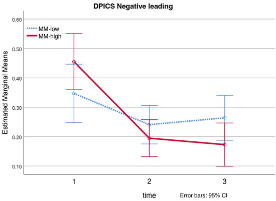 PCIT-Clinic: interaction effect for DPICS negative leading. Note. MM-low = mothers with a medium-low level of mind-mindedness; MM-high = mothers with a medium-high level of mind-mindedness.