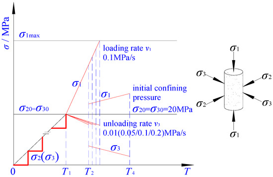 Based on the buried depth of the coal seam, the stress was estimated around 20 MPa in original rock status, which was selected as the original confining pressure. As demonstrated in Figure 3, the test procedure was designed and implemented to unload the confining pressure and increase the shaft pressure.