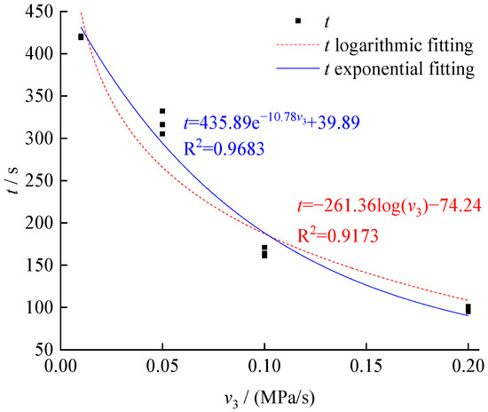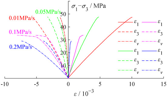 - In order to control the stress, the shaft pressure, σ1, was increased at a constant rate of v1 = 0.1 MPa/s; meanwhile, the confining pressure in sample σ3 was decreased at the rate of v3, following the rate setpoint of 0.01, 0.05, 0.1, and 0.2 MPa/s until the failure of the test sample.