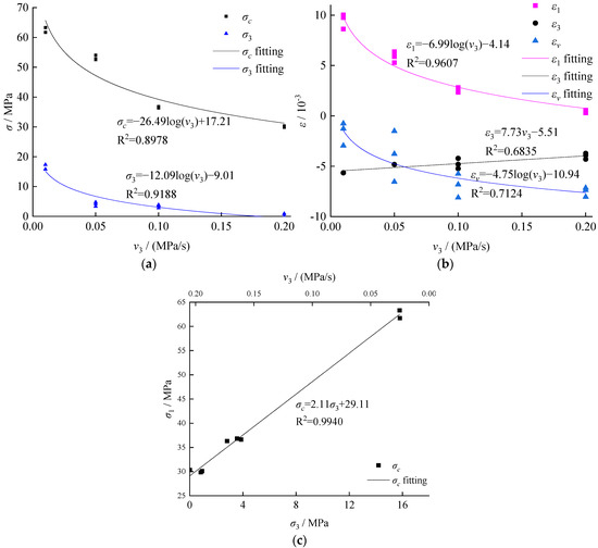 Relation among strain, stress, and unloading rate of the confining pressure: (a) failure strength and confining pressure, (b) strain, and (c) relation among the unloading rate of the confining pressure, the confining pressure, and failure strength.