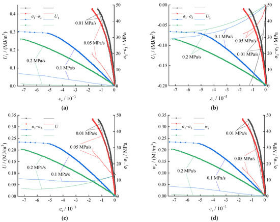 Substituting the test results in Equation (2), the energy evolution in the coal body corresponding to various unloading rates of the confining pressure was demonstrated in Figure 8.