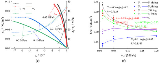 According to Figure 8a–e, as the unloading rate increased, the axial pressure of the test system did positive work, U1, while the confining pressure did negative work, U3. The total work, U, and releasable elastic strain energy, we, demonstrated a decreasing trend, resulting in a less obvious law of dissipated energy, wd, for coal degradation, which is consistent with the fitting results of the test data in Figure 8f. Meanwhile, the dissipated energy, wd, for coal degradation increased in a gradually reduced rate. Under an unloading rate below 0.1 MPa/s, some erratic changes were observed in the evolutions of various types of energies. Significant differences can be observed in the same energy at the failure. When the unloading rate exceeded 0.1 MPa/s, the changes in energies gradually became limited, reaching a status of satiability. When the unloading rate exceeded a threshold point, which was similar to the energy changes under the single axial compression, the differences in strain energy observed were mainly caused by the test samples.