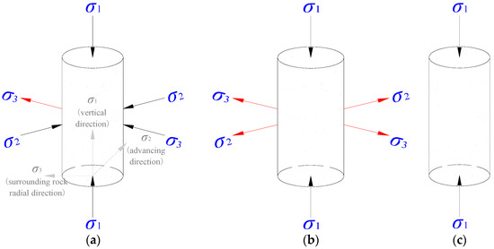 During the actual evacuation, the coal body of the study is subject to the constrain imposed by the surrounding rocks along the axial and radial direction of the roadway, resulting in unloading mainly taking place on the unrestricted side of the roadway and an unevenly distributed circular surrounding pressure, as shown in Figure 10a [27]. In the test, the unloading took place in a circular and evenly distributed pattern, resulting in an evenly distributed circular surrounding pressure, as demonstrated in Figure 10b. Under the condition of a high unloading rate, single axial loading can occur, as shown in Figure 10c, with a zero circular surrounding pressure [28]. The following conclusion can be drawn from the tests. Firstly, under the same condition, including the initial surrounding pressure, the loading rate of shaft, and the unloading rate, a lower decreasing rate of the surrounding pressure was observed in the actual excavation, demanding a higher input energy during the stress adjustment and a higher conversion rate of the releasable elastic strain energy. The coal body tends to degrade violently under a consistently high stress environment. In addition, one roadway side became less or not restricted, which increased the risks of dynamic disasters. Secondly, during the actual excavation, increasing the excavation speed was often adopted to increase the unloading rate, leading to difficulties in coal body deformation, a reduced elastic strain energy stored, and a lower conversion rate. A timely and effective support and protection system was needed to ensure safe construction, which explains the adoption of quick through excavation method under some circumstances [20]. Thirdly, regrettably, the existing research results are not yet sufficient to guide the production practice. More research on the control of the evacuation speed is needed in the future.