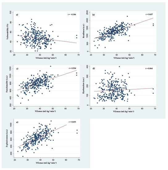 Correlation plots of VO2max with (a) vulnerability, (b) readiness, (c) functionality, (d) dysfunction, and (e) explosiveness scores derived from a 3D-MCS during functional movement screening protocol.