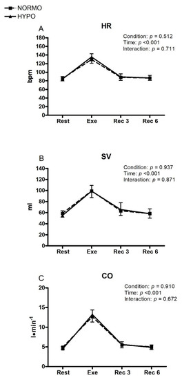 Based on the results of the present study, our hypothesis that moderate AH affects hemodynamics during mild dynamic exercise in healthy, physically active males should be rejected. We found that neither VFR, which is a measure of diastolic flux, nor VER, which is a measure of cardiac performance, were significantly different between the NORMO and HYPO tests. Therefore, AH did not induce any significant changes in the rate of ventricular filling and emptying. Accordingly, we also found that SV, which depends on a balance between ventricular emptying and filling [26,27,28], was unaffected by AH.
