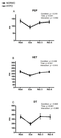 Figure 4 demonstrates that all the time variables of the cardiac cycle decreased during exercise, without any difference between tests. In detail, during the exercise phase of the NORMO and HYPO tests, the PEP level was 93.5 (CI: 81.9–105.1) vs. 90.1 ms (CI: 81.0–99.1) (panel A), the VET level was 178.3 ms (CI: 167.1–189.5) vs. 172.9 ms (CI: 166.5–184.8) (panel B), and the DT level was 364.3 ms (CI: 307.1–421.5) vs. 358.5 ms (303.3–413.7) (panel C).