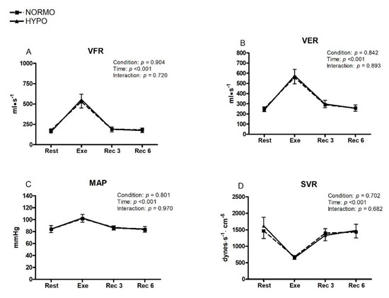 Figure 5 shows that during the exercise phase of the NORMO and HYPO tests, VFR, VER, and MAP increased without any detectable effect of condition. In particular, VFR reached a value of 528.9 mL·s−1 (CI: 451.4–606.4) vs. 556.4 mL·s−1 (CI: 419.7–621.1) (panel A), VER a value of 558.9 mL·s−1 (CI: 497.2–620.6) vs. 577.3 mL·s−1 (CI: 516.8–637.8) (panel B), and MAP a value of 101.6 mmHg (CI: 101.0–112.2) vs. 102.7 mmHg (97.0–108.4) (panel C) for the NORMO and HYPO tests, respectively. Figure 5 (panel D) also shows that SVR decreased during the exercise phase of both tests, reaching a level of 677.0 dynes·s−1·cm−5 (CI: 669.5–684.4) vs. 648.8 dynes·s−1·cm−5 (CI: 679.6–718.8) in the NORMO and HYPO tests, respectively, without any condition effect.