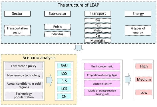 In order to aid the understanding of the methodological system, we present a schematic framework, as shown in Figure 1. The whole framework consists of three parts. First, the LEAP model of the transportation sector is built. According to the service provider, the urban transportation is divided into public transportation and individual transportation. The public transportation is further divided into bus, taxi and the metro, and the individual transportation is divided into private car and motorbike. Second, from a regional perspective, five different scenarios are set according to the severity of low-carbon policies, the development of new energy technologies and the popularization of technologies: Business-As-Usual Scenario (BAU), Energy-Saving Scenario (ESS), Energy-Saving–Low-Carbon Scenario (ELS), Low-Carbon Scenario (LCS) and Carbon Neutral Scenario (CN). Third, from the variation setting perspective, the CO2 emission trend of the urban transportation sector in different scenarios is predicted through three kinds of growth rates of high, middle and low. Finally, the driving factors in each scenario and CO2 emission reduction pathways in cold region are analyzed.