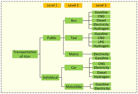The LEAP model is an energy-planning system developed by the Stockholm Environment Institute and the University of Boston, and it is widely used to analyze energy policy and assess climate change mitigation [14]. LEAP is a prominent model that has been used in 190 countries, 85 UNFCCC country reports, and more than 70 peer-reviewed journal papers [16]. To address the issue of data availability, the LEAP model developed the Technology and Environmental Database (TED), which can be used as a stand-alone tool or as part of the LEAP model to calculate carbon emissions from different energy mitigation options. The LEAP model has the characteristics of transparent data input, high flexibility and can be flexibly adjusted according to the existing data. The LEAP model developed in this paper is in line with the specific situation of the urban transportation sector in cold regions. The LEAP model consists of three levels, with 2017 as the base year and 2060 as the final year. According to the relevant statistical data, level 1 consists of public transportation and individual transportation. Level 2 includes bus, taxi, the metro, car and motorbike. Since bicycles and walking do not use energy, they are not discussed in the model. In level 3, the energy resources mainly consist of gasoline, diesel, LPG, CNG, electricity and hydrogen. The scenario setting and parameter setting will be detailed in Section 2.5. The specific model structure is shown in Figure 2.