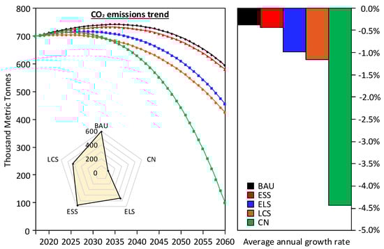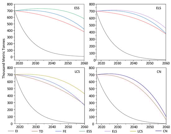 As shown in Figure 3, LEAP is used to predict the CO2 emissions of the transportation sector in Jilin under five scenarios. The results indicate that the peak values under the five scenarios are between 704.7 TMt and 742.1 TMt. Peak year of BAU is 2035, and the peak value is 742.1 TMt. The peak value of ESS is 732.4 TMt in 2033. In ELS, the peak year is 2028, and the peak is 716.6 TMt. The peak year under LCS is 2025, and the peak is 713.9 TMt. The peak year under CN is 2023, and the peak value is 704.7 TMt. With the exception of BAU and ESS, the other three scenarios all reach the peak value of CO2 emission before 2030, and the peak time gradually moves forward with the degree of policy stringency. During 2017–2060, the average annual growth rate of CO2 emissions under the five scenarios is −0.38%, −0.44%, −0.99%, −1.15% and −4.43%, respectively. Although the peak time and peak value under CN are the best in the five scenarios, this scenario is not realistic for mid-to-late industrialization and urbanizing developing regions, such as Jilin. Limiting social and economic development to reduce CO2 emissions, the LCS can no longer meet the requirements of improving living standards. To sum up, it is impossible for Jilin to achieve a net zero emission under CN, and an ideal low-carbon society under LCS in the short-term also ignores future energy saving policies and new technologies. Therefore, ELS is the suitable situation of Jilin.