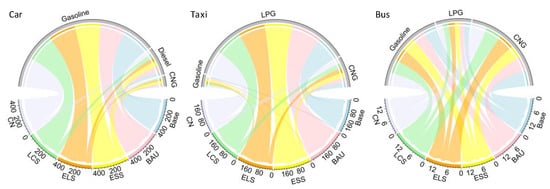 Due to the low share of motorbikes under cold climatic conditions, motorbikes are not considered as the key research objects, and the research mainly focuses on private cars, taxis and buses. In general, cars in cold regions account for the largest proportion of CO2 emissions in the transportation sector, followed by taxis and buses. People in cold regions are more inclined to buy private cars due to the low temperature, difficulties in taking a taxi and long waiting time for buses. As shown in Figure 4, the CO2 emission generated by car ranges from 224.6 TMt to 230.2 TMt, accounting for 24.4% to 35.9% of the total CO2 emissions. Car heating in winter increases the CO2 emissions in cold regions, and people prefer private cars to travel because of the cold climate. The CO2 emissions generated by taxis are 159.8–170 TMt, accounting for 23% of the total CO2 emissions. The cold climate also increases the probability of people taking taxis, especially in extreme climates, rainy and snowy days. The CO2 emission of buses is between 57 TMt and 87.9 TMt, accounting for 8–12% of the total CO2 emissions. The CO2 emission of motorbikes is less, in the range of 24.4–35.9 TMt, and their share in the total CO2 emissions is basically stable, at about 5%. In addition, the use of snow tires on all types of vehicles also increases the CO2 emission. Under ELS, cars, taxis, buses and motorbikes emit 226.3, 164.4, 82.4 and 35.9 TMt in peak years, respectively, accounting for 32%, 23%, 11% and 5% of the total CO2 emissions. Other activities account for a relatively small proportion, and the metro and hydrogen-powered vehicles do not directly contribute to CO2 emissions. As a result, cars, taxis and buses account for more than 60% of CO2 emissions in the transport sector in cold regions. On this basis, it is believed that these three ways of traffic are the key influencing factors to promote CO2 emission reduction.