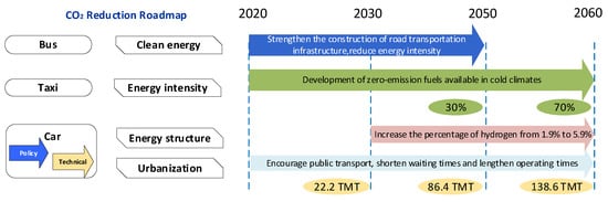 According to the ELS, new energy vehicles will become a mainstream product, basically realizing electric transformation in 2060. Reducing coal and oil consumption would increase the proportion of electricity to 30% by 2030 and 70% by 2060, separately. As shown in Figure 6, by 2030 and 2060, the share of hydrogen in terminal energy will increase to 1.9% and 5.9%, respectively. By 2060, the terminal energy intensity of each branch will be reduced by 0.2%, and the metro transit will account for more than 40% of the total CO2 emissions. In the short term, the construction of public transport infrastructure would be strengthened in cold regions to promote the implementation of the public transportation priority policy, such as shortening the waiting time, lengthening the running time of vehicles, reducing the empty load rate and enhancing energy efficiency. In the long run, in order to decrease the growth of CO2 emissions, zero-emission fuels available in cold regions would be developed; the durability of fuel cells at low temperatures would be promoted; the utilization of hydrogen would be expanded; the research and development of hybrid combustion technology of hydrogen and natural gas would be accelerated; and the construction density and the amount of charging piles would be increased. Before 2030, electric vehicles are difficult to widely popularize in cold regions, and the peak time cannot be greatly advanced. After 2030, if technological breakthroughs accelerate the adoption of electric cars, the peak time could be moved much earlier. In the long term, actions toward clean-energy vehicles, and the development of public transportation should receive more attention based on the mitigation-effect calculations of the LEAP model.