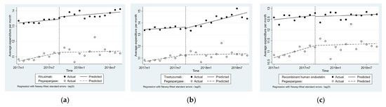 Average procurement expenditure (in 1000 RMB, log form) of three targeted anticancer drugs: (a) Rituximab; (b) Trastuzumab; (c) Recombinant human endostatin.