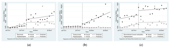 Table 3 and Figure 2 show that compared with Pegaspargase, the monthly average procurement volume of Rituximab, Trastuzumab, and RHE increased by 99.51 DDDs (p < 0.1), 3673.17 DDDs (p < 0.01), and 30.73 DDDs (p > 0.1), respectively, after the implementation. The procurement volume of Rituximab increased immediately by 949.60 DDDs (p < 0.05) compared with the immediate change of the comparison group. No significant differences of level change were found for Trastuzumab and RHE respectively compared with control group.