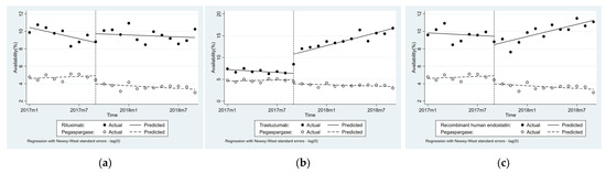 Table 3 and Figure 3 reveal that the monthly average availability of Rituximab, Trastuzumab, and RHE increased by 0.24 (p < 0.1), 0.66 (p < 0.01), and 0.32 (p < 0.01) percentage points, respectively, compared with Pegaspargase. The immediate level change of availability for Rituximab and Trastuzumab increased by 1.56 percentage points (p < 0.1) and 5.24 percentage points respectively compared with Pegaspargase.
