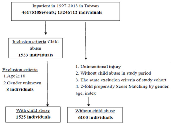 This was a matched case-control study. We selected patients under the age of 18 who were diagnosed with child abuse in accordance with the International Classification of Diseases, Ninth Revision (ICD-9) codes 995.5 Child maltreatment syndrome and E967 Perpetrator of child and adult abuse [18] between January 1997 and December 2013 from the NHIRD as the child abuse group for this study. Category 995.5 includes 995.50 Child abuse, unspecified, 995.51 Child emotional/psychological abuse, 995.52 Child neglect (nutritional), 995.53 Child sexual abuse, 995.54 Child physical abuse, 995.55 Shaken infant syndrome, and 995.59 Other child abuse and neglect; Category E967 Perpetrator of child and adult abuse includes E967.0 By father, stepfather, or boyfriend, E967.1 By other specified person, E967.2 By mother, stepmother, or girlfriend, E967.3 By spouse or partner, E967.4 By child, E967.5 By sibling, E967.6 By grandparent, E967.7 By other relative, E967.8 By non-related caregiver, and E967.9 By unspecified person. The date of first diagnosed child abuse case was treated as the index date.