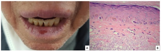 Actinic cheilitis (AC) is a chronic inflammation of the lip, with exposure to ultraviolet radiation being the most important etiologic agent in its development. The prevalence of AC has been reported to vary between 0.45% and 2.4%, and increasing up to 43.2% if only outdoor workers are considered [,]. Risk factors for the development of AC are outdoor work, smoking, fair skin and immunosuppression. AC is clinically characterized by a poorly demarcated border of the lip with a white scaling plaque, erythema, atrophy, edema, hyperkeratosis and erosions (Figure 1A). The lower lip is the most frequently affected location, which is usually affected in a diffuse manner, although it can also present as a localized lesion in a small area []. Dermoscopy shows white structureless areas, vascular telangiectasia, scales and erosions []. Its diagnosis is usually based on presenting history and clinical evaluation, although a lip biopsy is mandatory in case of infiltrating lesions suggestive of squamous cell carcinoma (SCC). The most common histopathological findings are epithelial dysplasia (singularly cell atypia and loss of polarity of keratinocytes) jointly with hyperkeratosis, parakeratosis, acanthosis, solar elastosis and inflammatory infiltrates (Figure 1B) [].