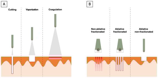 Among different laser types, the carbon dioxide (CO2) laser is one of the most widely used in dermatology. Indications include treatment of benign or malignant lesions and the field of esthetic dermatology []. The CO2 laser emits light energy in the form of a beam of photons at 10,600 nm, which is absorbed by water, the specific chromophore. As a consequence, vaporization of the intracellular water produces an ablation of the tissue locally and a small amount of diffusion of thermal energy to adjacent structures, reaching a good hemostasis. Through moving the handpiece towards or away from the focal point of the beam, a CO2 laser can be used for cutting, vaporization or coagulation []. There are different types of CO2 lasers: fractionated (ablative and non-ablative) and non-fractionated (Figure 2). In addition, this type of laser can be used in two different modes: continuous-wave (a continuous beam of light without power variation) or pulsed. Finally, there are also the super-pulsed and ultra-pulsed mode that have allowed treatment with maximum power and very short pulse durations (0.1–100 milliseconds, several hundred pulses per second), achieving high peak power to cut tissue precisely and a minimization of energy diffusion to adjacent tissue effects. Erythema and oedema of the area are the most frequent side effects after treatment, in addition to pain associated with the procedure or post-treatment pain.