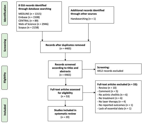 Flow diagram showing the identification and selection process of primary-level studies in this systematic review, analyzing the clinical implications of laser therapy in patients suffering from actinic cheilitis.