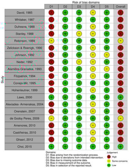 - Sterne, J.A.C.; Savović, J.; Page, M.J.; Elbers, R.G.; Blencowe, N.S.; Boutron, I.; Cates, C.J.; Cheng, H.-Y.; Corbett, M.S.; Eldridge, S.M.; et al. RoB 2: A revised tool for assessing risk of bias in randomised trials. BMJ 2019, 366, l4898. [Google Scholar] [CrossRef] [Green Version]