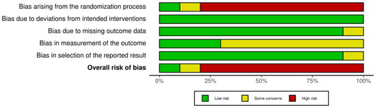 The methodological quality across primary-level studies was critically appraised using the Cochrane Collaboration’s RoB-2 tool for assessing risk of bias []. The following potential biases were explored categorized into five specific domains: (1) randomization process; (2) deviations from intended interventions; (3) missing outcome date; (5) selection of the reported result. The risk of potential bias was evaluated as low risk of bias, some concerns, or high risk of bias for each domain. These domains were independently evaluated in each primary-level study, recording the particularities and potential biases observed. A sixth and final domain assesses the overall risk of bias based on the previous five domains. The risk of bias plots were drawn using the Cochrane robvis web app [].