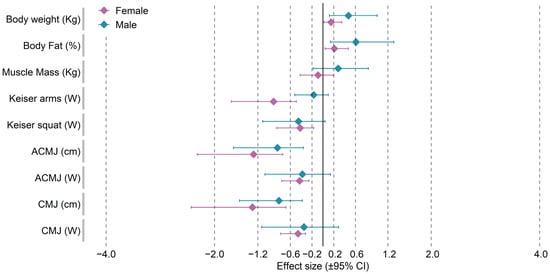 Standardized mean changes and 95% confidence intervals between the pre- and post-detraining evaluation of physical fitness variables in female and male swimmers.