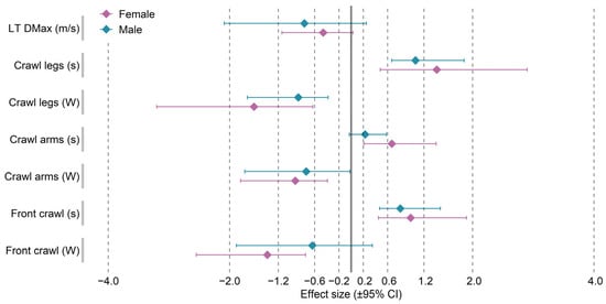 Table 2 shows the results from the measurements performed in water after the TP and DP periods. The analysis of variance revealed no significant interaction effects for Detraining × Gender in any of the tests conducted. For the anaerobic threshold speed results (LT DMax), the analysis of variance revealed a significant main effect of Gender (F = 78.56, p < 0.001) and Detraining (F = 5.37, p = 0.039). However, the observed insignificant differences in the measurements performed before and after detraining within each gender were not statistically significant. Of all the tests performed in water, the analysis of variance revealed no significant effect of the Detraining factor (F = 4.27, p = 0.061) only for Front Crawl (W). For the same variable, no statistically significant difference was observed for the male group in the measurements separated by the detraining period (32.9 ± 2.76 W vs. 28.9 ± 7.72 W; p = 0.229; ES = moderate). Furthermore, in the men’s group, the measurements taken before and after the detraining period revealed no statistically significant differences for either time (12.7 ± 0.76 s vs. 12.9 ± 0.67 s; p = 0.547; ES = small) or power (28.0 ± 2.43 W vs. 24.7 ± 5.34 W; p = 0.143; ES = moderate) generated when swimming using the arms only, as in the front crawl. In all the other in-water test results for swimming with the legs only, the arms only, and using an entire stroke (Front Crawl test) in both groups, the analysis of variance showed a significant effect of the Gender and Detraining factors. Statistically significant increases in time and decreases in power were also found for all the variables discussed in both gender groups. Figure 2 shows the standardized mean differences (effect size) for the in-water test scores recorded before and after the detraining period.