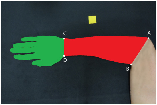 A photograph showing the examined segments of the upper limb with the applied colour and a square with a known surface area. Lines of separation: from the top of the elbow (A) to the innermost incision on the opposite side (B) and from the styloid process of the ulna (C) to the styloid process of the radius (D).