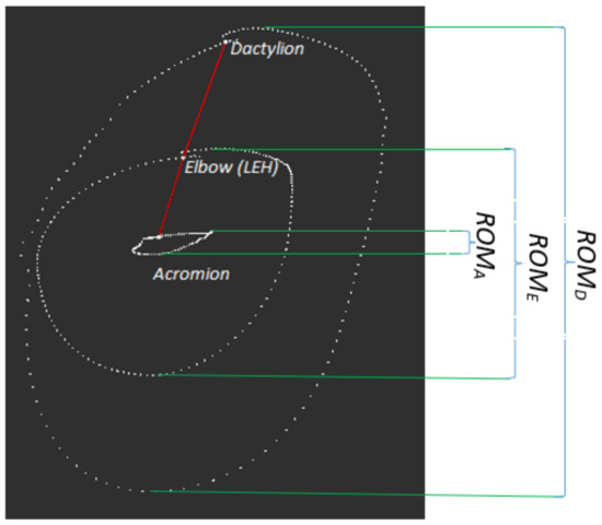 Measurements were carried out by using the three-dimensional motion analysis system SMART-D (BTS, Milano, Italy). The system consisted of six synchronized cameras (70 Hz) recording infrared light reflected from passive markers placed on the upper limb of the examined person at three anatomical points: the acromion, the lateral epicondyle of the humerus, and the dactylion. Markers were attached to the subject’s body at the selected anatomical points by one experienced researcher, a physiotherapist. While the examined subject standing in an upright position was performing a movement that imitated the front crawl swimming technique, the displacement of markers placed on his body was registered. The obtained results were then processed in the BTS system modules: Tracker and Analyzer. The performed calculations allowed the values of the vertical (cranio-caudal) marker displacements, which are an estimate of the horizontal linear ranges of the motion of individual body parts in swimming pool conditions, to be obtained. Figure 2 shows the tracks of the markers and linear ranges of motion during one movement cycle.