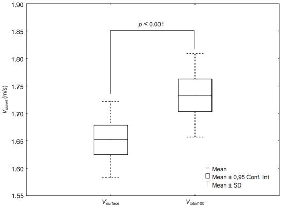 The two separated average speeds (Vsurface, Vtotal100) of the 100 m front crawl race were significantly different (p ≤ 0.001, ES = 1.09 [moderate], 95% CI: 0.90–1.36) (Figure 3).