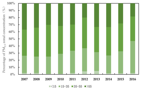 With the rapid changes occurring in industrialization and urbanization, China’s economic development has been expanding in recent decades. Consequently, massive haze pollution has been generated from such rapid economic development and it can no longer be ignored. In response to the frequent and widespread haze pollution problem, the Chinese government is now paying much greater attention to it. The Action Plan for the Prevention and Control of Air Pollution was issued in 2013, aiming to reduce the concentration of fine particles. PM2.5 is one of the most widespread pollutants among fine particles. The Ministry of Environmental Protection adopted the Ambient Air Quality Standards (GB3095-2012) in 2012. It stipulates the annual average concentration limit of PM2.5, with the primary limit standard of 15 μg/m3 and the secondary limit standard of 35 μg/m3. As seen in Figure 1, the proportion of PM2.5 annual average concentration below the secondary concentration limit experienced an increase from 26.27% in 2007 to 36.86% in 2012, followed by a sharp decline from 31.32% in 2013, and a steady increase up to 47.06% in 2016. The proportion of PM2.5 annual average concentration is higher than 55 μg/m3 but did decline gradually to 36.86% in 2007, then 18.43% in 2016 after a slight rebound in 2010 (31.76%) and 2013 (33.21%). The national average of PM2.5 concentration was 47 μg/m3 in 2016, with a 29% decrease compared to 2013.