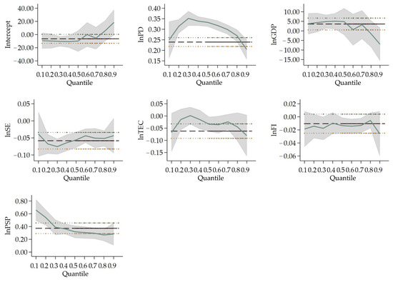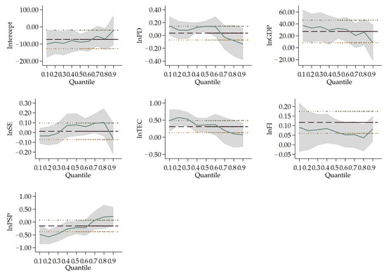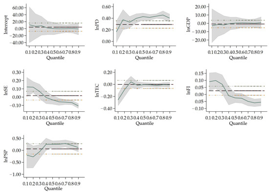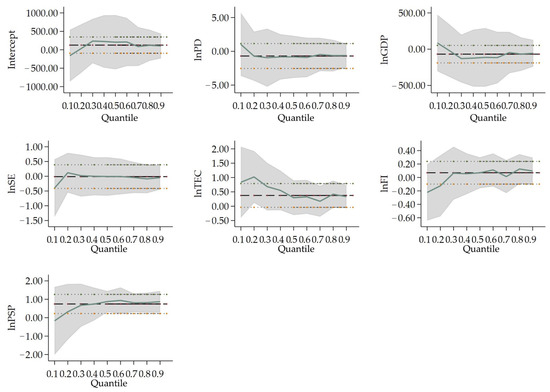 Change in variables’ coefficients in Type I cities’ quantile regression. Notes: The thicker dashed lines indicate the OLS regression estimates for the independent variables; the area which is parallel with thinner dashed lines is the confidence interval (95% confidence level) for the regression coefficients; The solid lines are the quantile regression coefficients of the respective variables, and the shaded area is the confidence interval (95% confidence level) of the quantile regression analysis estimates. The horizontal axis is the quantile of the dependent variable; the vertical axis is the regression estimate of the independent variable.