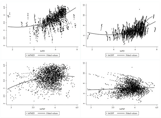 On the contrary, the ratio of secondary industry to the regional GDP has a significant negative effect on PM2.5 concentration for the following reasons. At the outset, the proportion of secondary industry is closely related to the level of urban economic development. When cities’ secondary industry expands, urban economic development increases. Secondly, as the latter increases (see Figure 2), cities with a comparatively high level of economic sophistication will gradually eliminate backward production methods and move high-polluted and energy-consuming industries to less developed vicinities. Greener and more intensive and sustainable industries will take their place. Thus, the pollution generated by these cities will be transferred to underdeveloped areas.