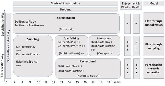 Contrary to DPR and the “early specialization way”, Côtè et al. [23,24,25] proposed deliberate play (DPL) and the “early diversification way” as an alternative in development to achieve the level of expertise. DPL activity is characterized as versatile and diversified sports practice and playful activity where interest is focused on the actual deployment. DPL includes classic self-organized neighborhood pickup games such as park football, which is usually played with small-sided teams and flexible peer-defined rules [24]. DPL activities involve an engagement of time in physical activities which is difficult to match in any kind of structured practice [26]. The DPL approach leads to positive motivation outcomes and increases a wide repertoire of transferable motor skills [6]. According to the Developmental Model of Sport Participation (DMSP) and the “early diversification way” (Figure 1), athletes should pass through three phases (sampling years, age 6–12; specializing years, age 13–15; investment years, age 16+) during their development in sport [25]. Those phases are continuous, which is applicable across high volumes of participation in DPL and involvement in various sports, with less structured and organized training to progressively decrease the participation in multiple sports and DPL, in favor of higher specialization, and DPR training [23,25,27].