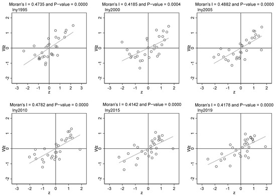 In addition, before the regression analysis, we further examined the spatial correlation of carbon productivity. Figure 1 draws the Moran scatter diagram of the carbon productivity of provinces and cities from 1995 to 2019 and reports the global Moran index and its test results. Throughout the study period, the global Moran’I over the years was significant at least at the 1% level, and the carbon productivity of provinces and cities showed indigenous spatial agglomeration characteristics. This suggests that factor flows and technical cooperation in neighboring provinces will indeed be more adequate and ignoring the spatial effects will lead to an estimation of the model and even wrong conclusions.